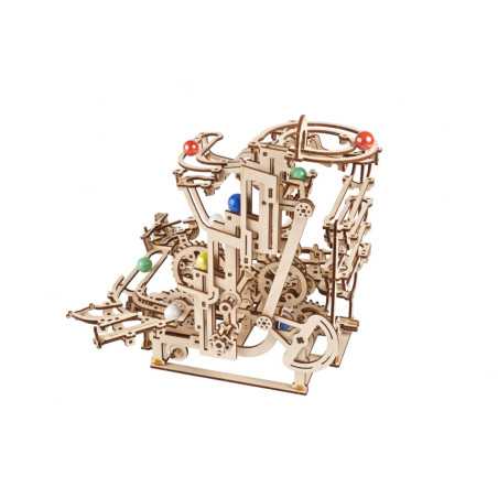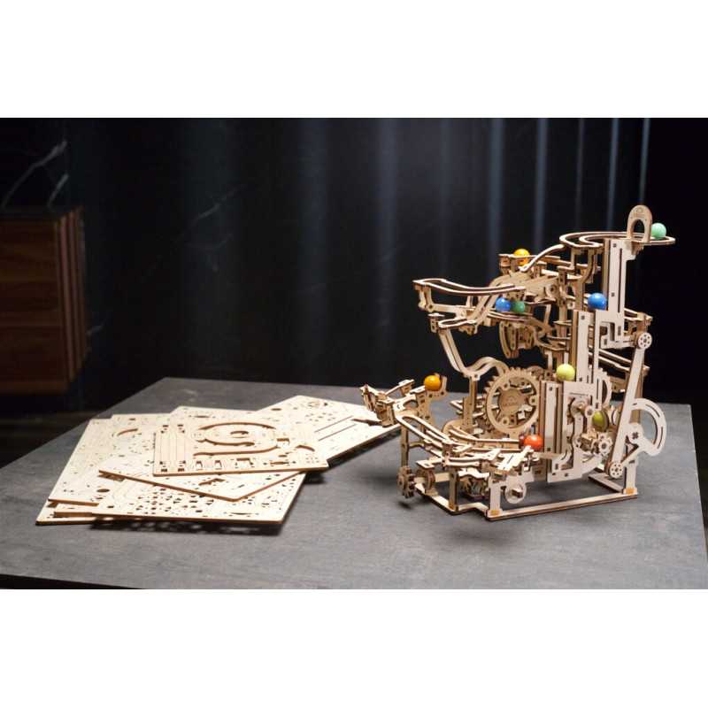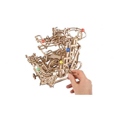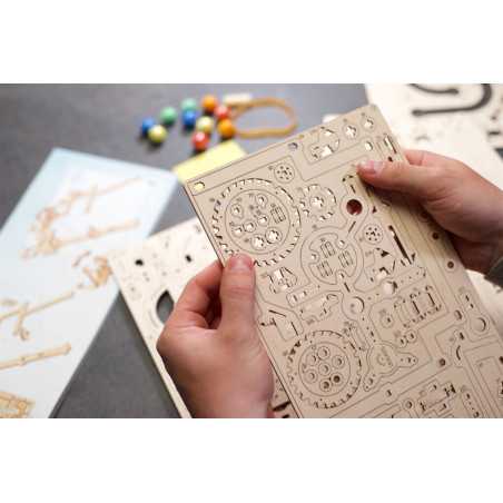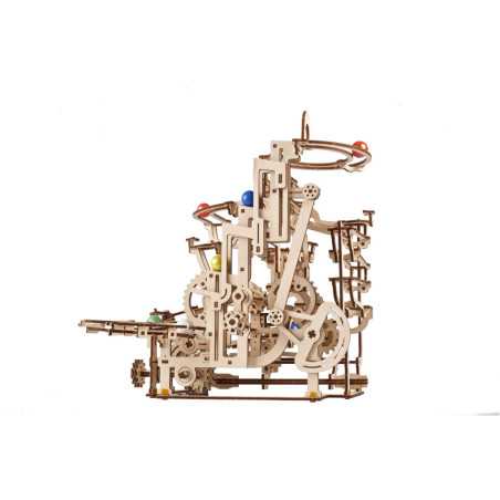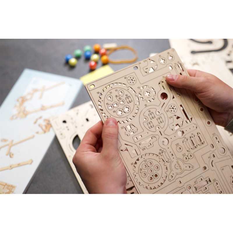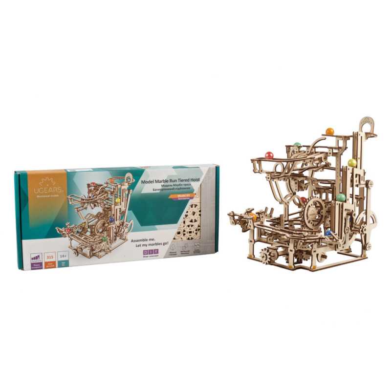 Marble Run Wciągnik Poziomowy to świetne wyzwanie dla doświadczonych modelarzy. Zrób sobie prezent, lub uciesz nim bliską osobę. Ciesz się wielogodzinną zabawą w konstruowanie. A gdy Twoje kulkowe arcydzieło DIY będzie gotowe, wyślij kuleczki na ich pierwszy, dziewiczy wyścig. Obserwuj, jak Twoja pomysłowa maszyna podnosi kuleczki na różne poziomy, a następnie wysyła je w dół po wielopoziomowej rampie. Czy to przez kolejkę górską, czy do pułapki, z której kuleczki mogą się wydostać tylko z niewielką pomocą kulastych “przyjaciół”. Wciągnik Poziomowy UGEARS Marble Run jest intrygującym samodzielnym urządzeniem lub może stanowić część skomplikowanej, połączonej kolekcji torów kulkowych UGEARS.