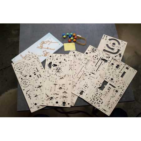 W zestawie znajduje się wszystko, czego potrzebujesz. Poszczególne elementy są wycięte laserowo z drewnianej sklejki wysokiej jakości i można je połączyć bez użycia kleju i specjalnych narzędzi. Do zestawu dołączona jest szczegółowa, ilustrowana instrukcja w 11 językach, która pomoże Ci w budowie. W zestawie znajduje się 10 kulek, a także papier ścierny i wosk do wygładzenia i nasmarowania zębatek i innych ruchomych części. Tor Kulkowy ma 315 elementów, jest na poziomie “zaawansowanym”, a przewidywany czas montażu to 5 godzin. Nie martw się, jeśli podczas budowy złamiesz jakiś element! Nasz zespół doskonałych pracowników obsługi klienta chętnie i bezpłatnie odpowie na Twoje zapytanie o części zamienne.