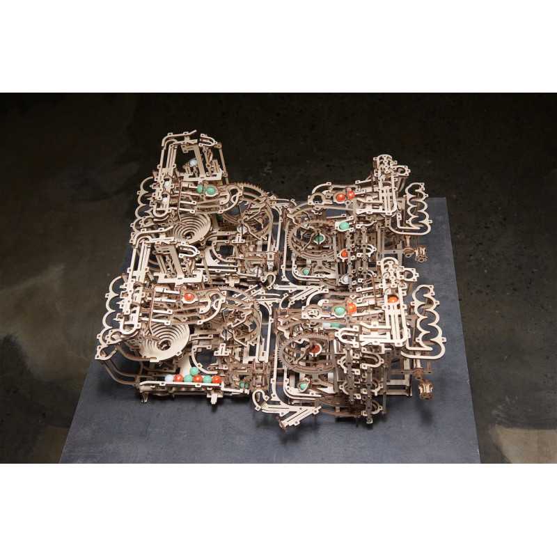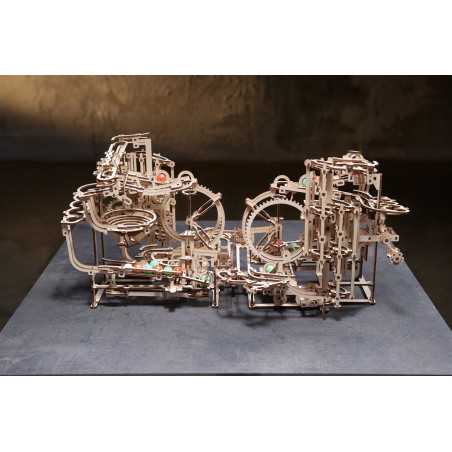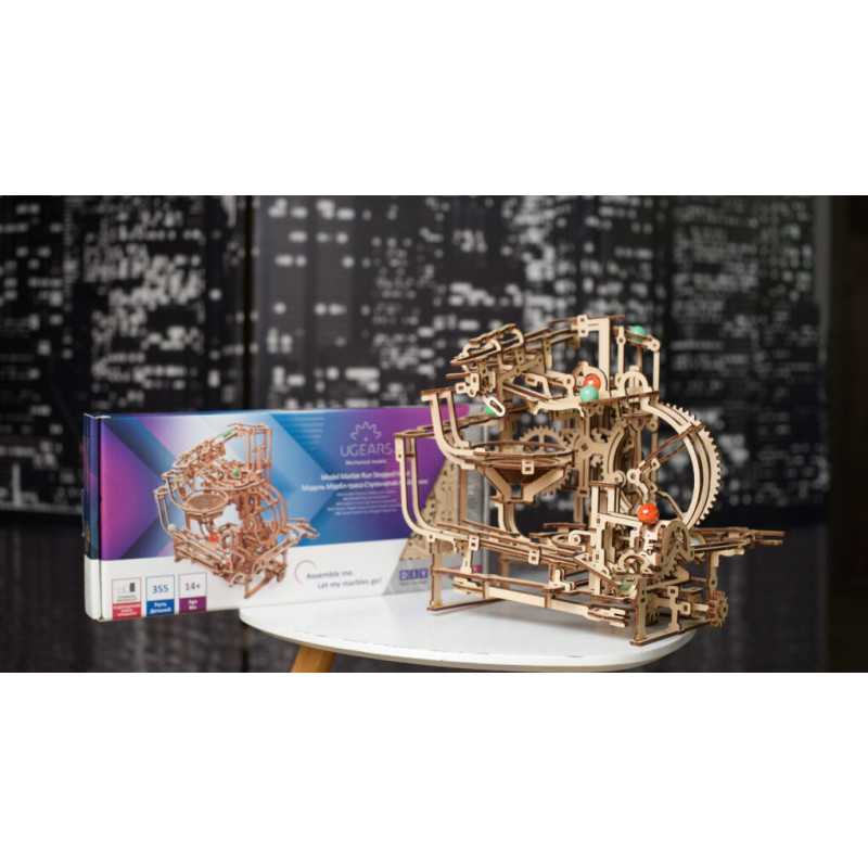 Zaprojektowaliśmy linię torów kulkowych Ugears modułowo, to znaczy, że każdy model działa jako samodzielny lub może być połączony czołowo lub bocznie z innymi torami kulkowymi Ugears o tej samej lub innej konstrukcji (można połączyć 2 lub 4 modele, parami, za pomocą specjalnych łączników dołączonych do zestawu). Mechanizm kołyskowy na końcu toru może przesuwać kulki w jednym lub drugim kierunku, lub w obu kierunkach (w zależności od dołączonego ciężarka), zwracając kulki do pierwotnego wyciągu lub przesyłając je do innego toru marmurowego. Dzięki sąsiadującym ze sobą torom marmurowym mamy teraz niesamowity, złożony system połączonych ze sobą elementów, a wszystko to napędzane jest jedną korbą. To jak miniaturowy park rozrywki! Miej oko na swój ulubiony marmur – kto wie, gdzie wyląduje, kiedy wróci do punktu wyjścia lub jakie przejażdżki odbędzie po drodze!