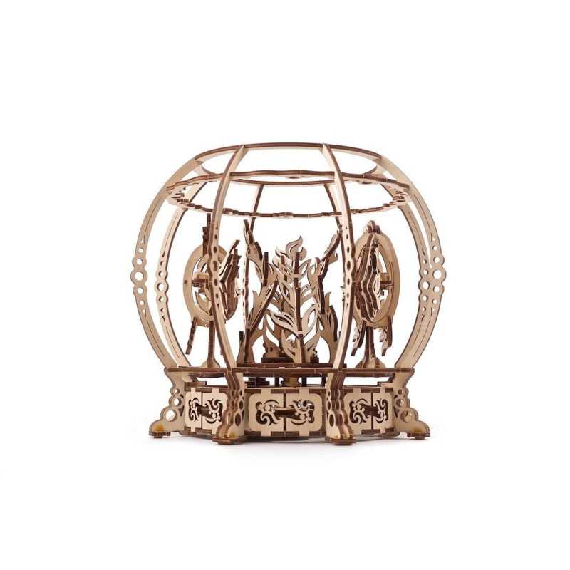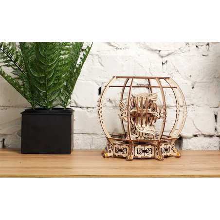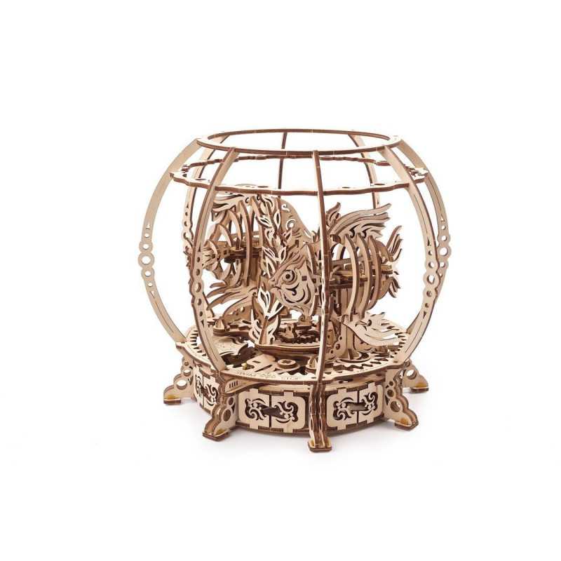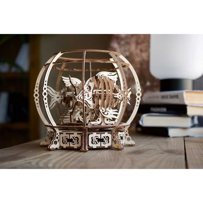 Mechaniczne akwarium składa się z 325 elementów, jest na poziomie “średnim”, a czas montażu wynosi 6 godzin. Podczas budowania drewnianego akwarium dowiesz się o działaniu i współdziałaniu kół zębatych napędzających i napędzanych w przekładniach, o działaniu wahadeł i o mechanizmach sprężynowych. Doświadczysz satysfakcji z własnoręcznego zbudowania czegoś pięknego, bez użycia kleju i specjalnych narzędzi. Wszystko, czego potrzebujesz do tego zabawnego projektu majsterkowicza, znajduje się w pudełku: wysokiej jakości arkusze ze sklejki z precyzyjnie wyciętymi laserowo elementami, które następnie wysuwasz i zatrzaskujesz, metalowa sprężyna, która napędza mechanizm, oraz oczywiście zestaw szczegółowych, ilustrowanych instrukcji w 11 językach.
