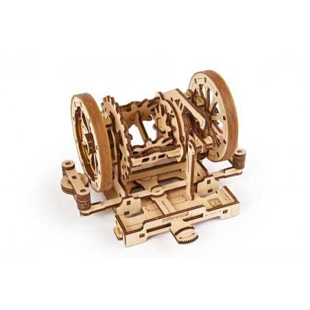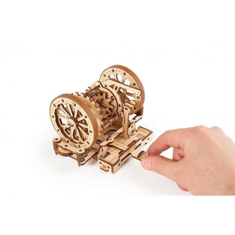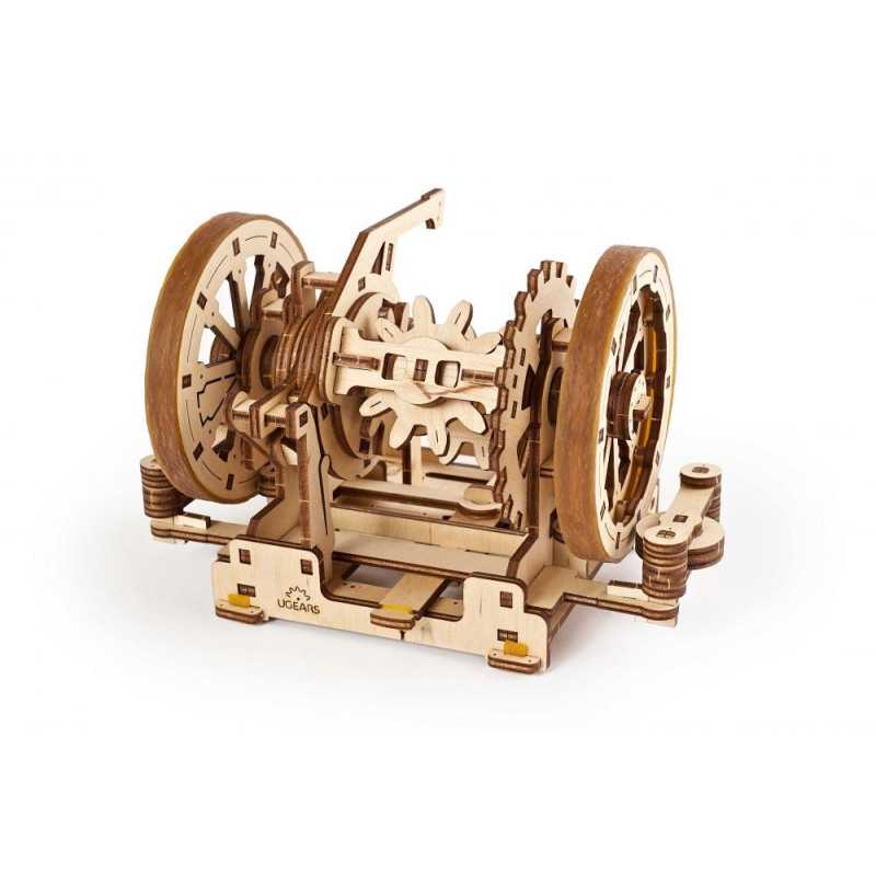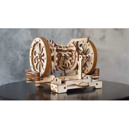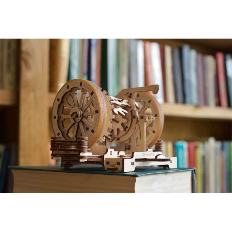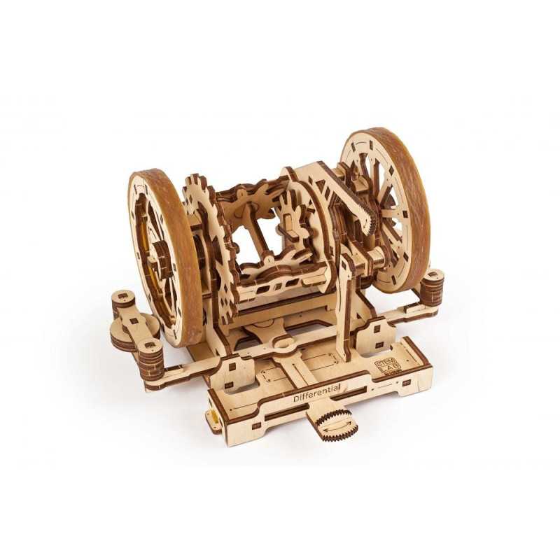 Mechanizm Różnicowy to stylizowany model edukacyjny. Interaktywny przewodnik po świecie mechaniki stworzony z myślą o poznaniu podstaw pracy danego modelu. Dyferencjał został zaprojektowany tak, by koła napędowe osadzone na tej samej osi obracały się w innymi tempie i pokonywały inny dystans w tym samym czasie. Mechanizm pozwala samochodowi zrobić skręt bez potrzeby zatrzymywania kół, poślizgu. Także zmniejsza zużycie opon oraz sprawia, że wejście i wyjście z zakrętu jest o wiele prostsze. Po złożeniu Dyferencjału możesz go odblokować przez naciśnięcie dźwigni na pozycję 1(do góry) i wprawienie kół w ruch przez obrót koła napędowego. Dźwignia kontrolna reguluje gładkie blokowanie odpowiednie prawego i lewego koła zależnie od tego, w jaką stronę ma być wykonany skręt. Kiedy dźwignia znajduje się w „dolnej” pozycji, oba koła są ze sobą sprzężone i mogą obracać się razem( przez napędzanie kołem napędowym) albo być zablokowane jednocześnie(za pomocą dźwigni).