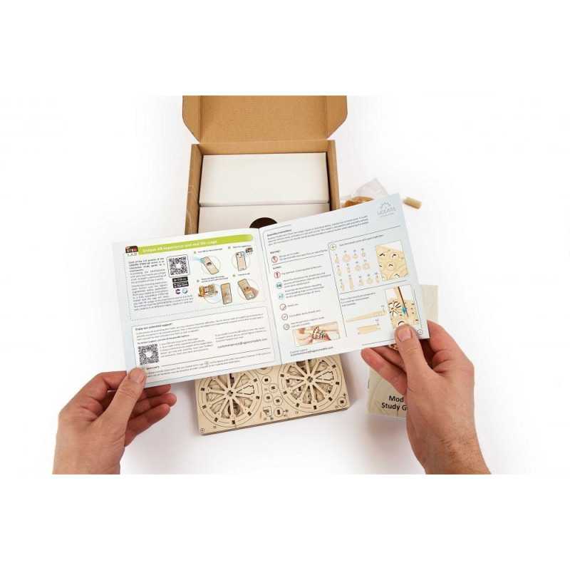 Eksperymentuj: w zestawie jest kieszonkowy przewodnik z historią powstawania Mechanizmu Różnicowego i ciekawymi zadaniami.