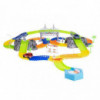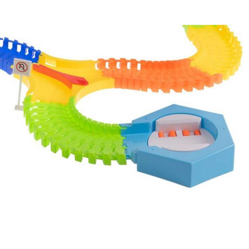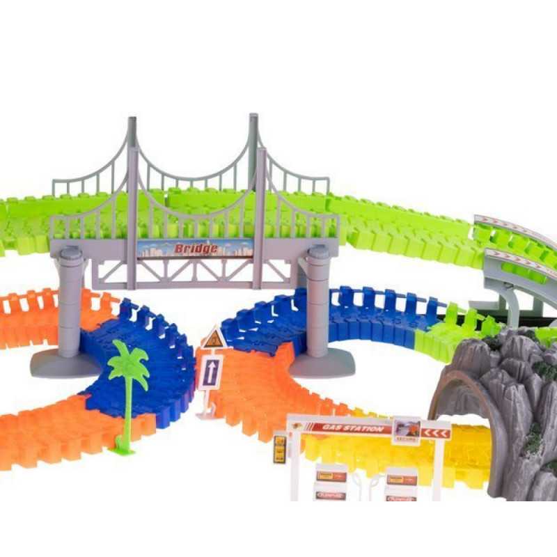 ELASTYCZNY – części toru są elastyczne, można je dowolnie układać – możliwości są nieograniczone, układ toru oraz kierunek jazdy można zmienić nawet podczas jazdy! W zestawie znajdują się 3 mosty, więc dziecko może również zbudować wzniesienia, czy też tunele. Tor jest spinany, dlatego łatwo się go składa oraz konfiguruje, dziecko może ułożyć jeden długi, bądź kilka mniejszych, np. pętelki.
