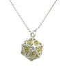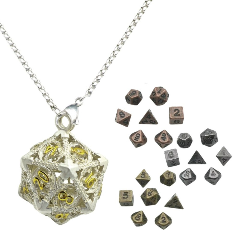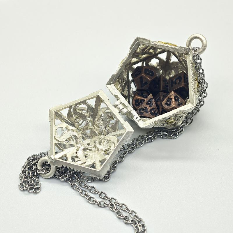 Metalowy Naszyjnik Kostka K20 Pudełko na Mini Zestaw Kostek - Artefakt Fortuny + Zestaw 7 Malutkich Metalowych Kości