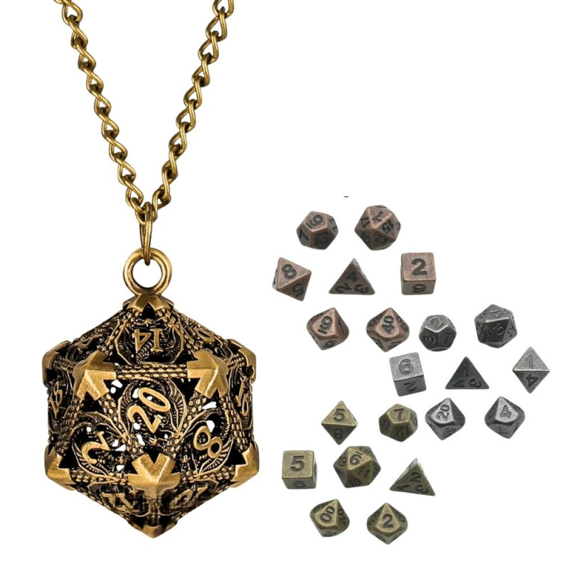 Metalowy Naszyjnik Kostka K20 Pudełko na Mini Zestaw Kostek - Nagroda w Turnieju + Zestaw 7 Malutkich Metalowych Kości
