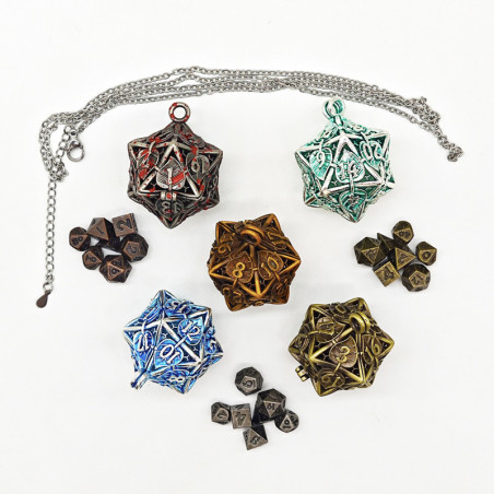 Metalowy Naszyjnik Kostka K20 Pudełko na Mini Zestaw Kostek - Serce Lasu + Zestaw 7 Malutkich Metalowych Kości