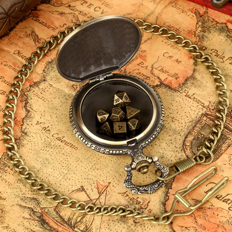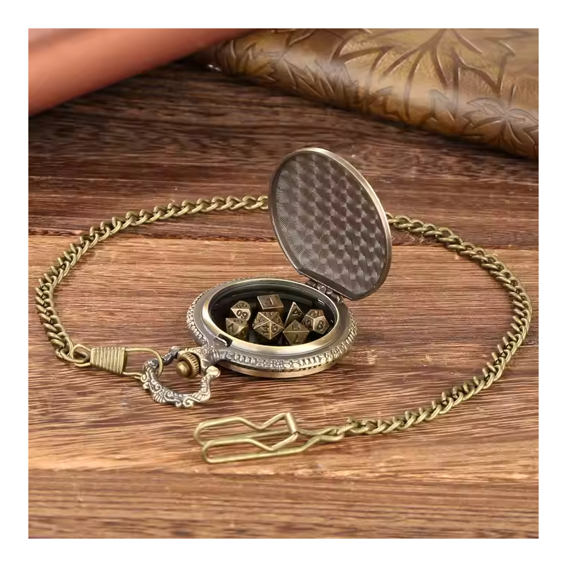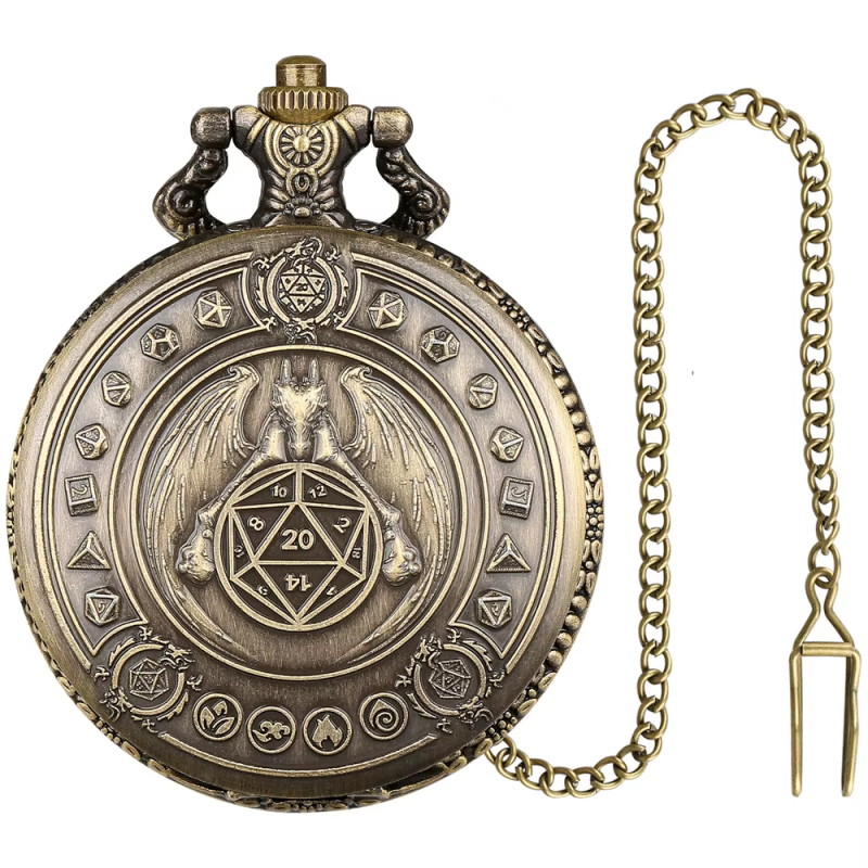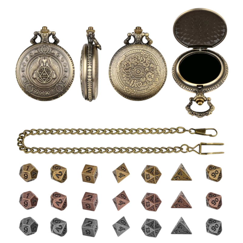 Ten metalowy zegarek kieszonkowy z minionych wieków nie pokazuje czasu. Skrywa w sobie tajemnicę - malutkie kosteczki o ściankach transmutowanych do rzutów w grach RPG. Podobno zegarek należał kiedyś do Żelaznego Alchemika, który poszukiwał kamienia filozoficznego gier planszowych i RPG. Był znany w naszych stronach. Teraz może należeć do Ciebie. Wyryty na nim krąg alchemiczny, w który wpisana jest kość K20 transmutuje wszystkie rzuty w naturalne sukcesy (jeśli nie, to znaczy, że robisz coś źle). Na wewnętrznej stronie osłonki wyryty jest napis “Nie zapomnij 3 paź 11”. Nikt nie wie, co się wtedy stało. Podejrzewamy, że mogło dojść do tragedii, która przebudziła moce dawnego wojownika, ale to tylko spekulacje. Ważne jest, byś i Ty nie wpadł w sieci pychy i zachłyśnięcia się mocą. Równoważ szczęście hojnością i nigdy nie zabieraj więcej niż to konieczne. W ramach podziękowań Cech Alchemików odwdzięczy Ci się wiedzą, funduszami i społecznością, w której w końcu ktoś Cię doceni. A to chyba najlepsza moc, prawda?