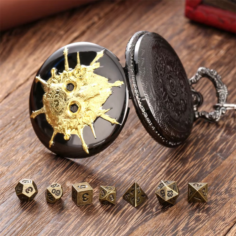 Metalowy Zegarek Kieszonkowy Pudełko na Mini Zestaw Kostek - Kieszeń Wieczności + Zestaw 7 Malutkich Metalowych Kości