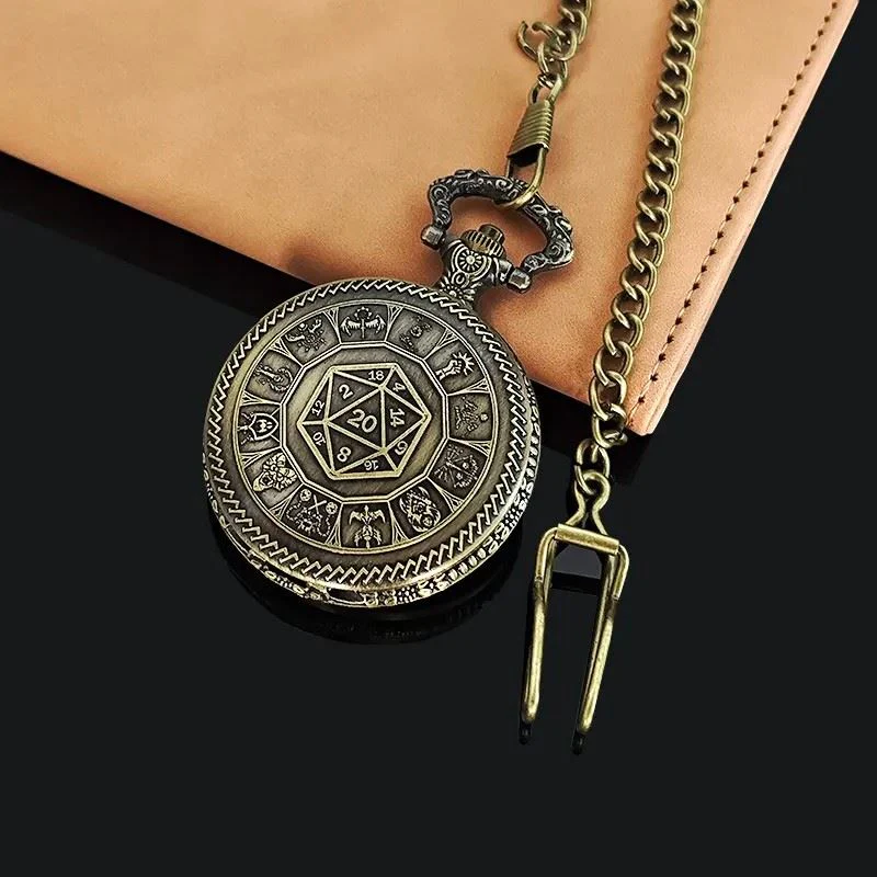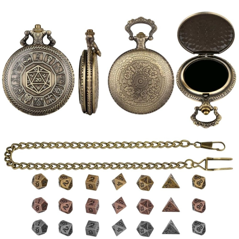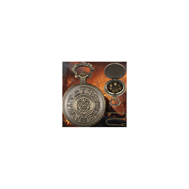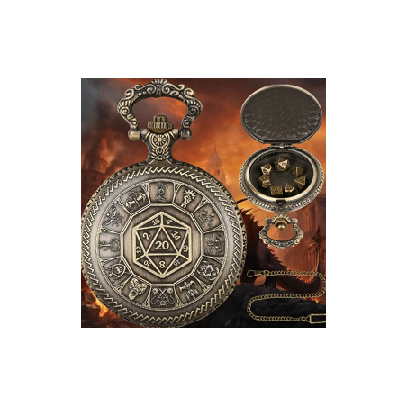 Pudełko w kształcie zegarka kieszonkowego to elegancki i funkcjonalny dodatek, który łączy klasyczny design z praktycznością. Wystarczy jedno otwarcie, aby mieć pod ręką wszystko, co niezbędne do każdej sesji – bez potrzeby szukania kości w torbie czy plecaku. Wykonany z metalu, zegarek prezentuje się stylowo i solidnie, a jego kieszonkowa forma sprawia, że zawsze możesz mieć go przy sobie. To doskonały wybór dla graczy, którzy cenią połączenie pasji z elegancją, a także dla tych, którzy szukają niepowtarzalnego sposobu przechowywania swojego zestawu kości.
