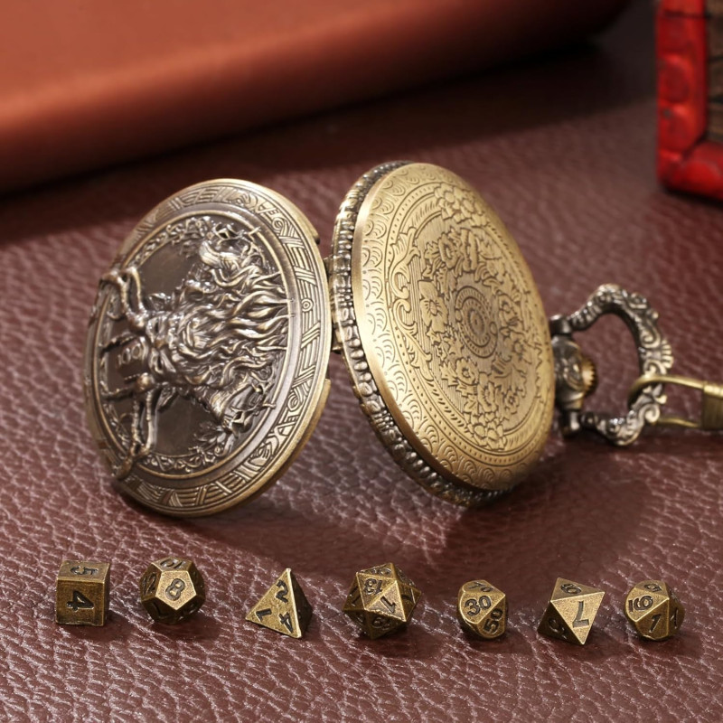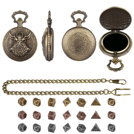 Metalowy Zegarek Kieszonkowy Pudełko na Mini Zestaw Kostek - Leśny Dziad + Zestaw 7 Malutkich Metalowych Kości