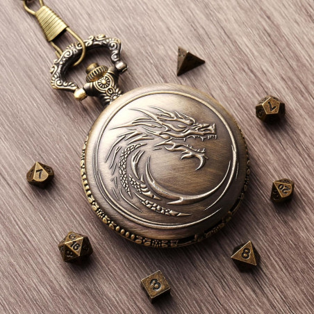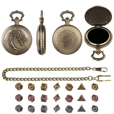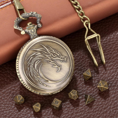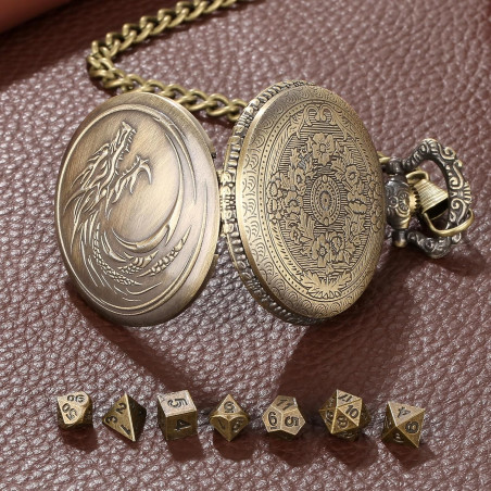 Metalowy Zegarek Kieszonkowy Pudełko na Mini Zestaw Kostek - Medalion Smoka + Zestaw 7 Malutkich Metalowych Kości