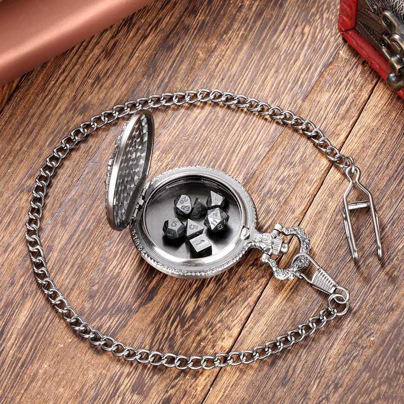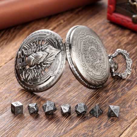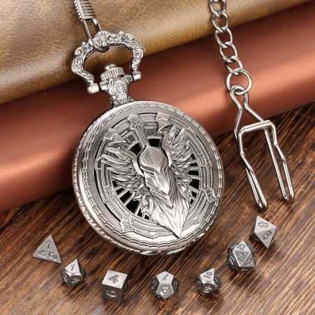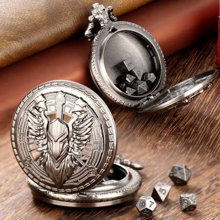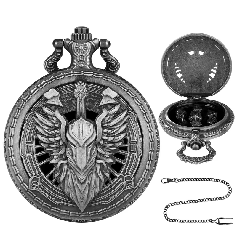 Ten metalowy zegarek kieszonkowy z minionych wieków Królestwa nie pokazuje czasu. Skrywa w sobie rycerską tajemnicę - malutkie kosteczki do rzutów w grach RPG. Nosili go ongiś dowódcy Zakonu Paladynów, gotowi na testy wiary i praworządności w każdej chwili. Teraz może należeć do Ciebie. Poczuj jego wirujące boskim blaskiem ścianki. Anielskie skrzydła wolności, które wyrastają podobiźnie pierwszego Świętego Rycerza na awersie zegarka prowadzą wiernych ku świętości, prawości i dobru. Uczą pokory. Legenda mówi, że sam okaleczony bóg spotkał się z paladynem w jego ostatnich chwilach żywota, by poprowadzić go przez ciemną dolinę do niw zielonych. Być może, jeśli będziesz podążał ścieżką praworządnie dobrą jako świątobliwy mąż miecza, dostąpisz tego samego zaszczytu. No nic, ja nie jestem zbyt wierny i nie w głowie mi świętości, więc dla mnie to tylko błyskotka, której chce się pozbyć. Za odpowiednią opłatą. To co? Bierzesz? Widzę, jak świecą Ci się oczka, jak cherubinkowi. Jakby zegarek Cię wzywał…