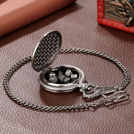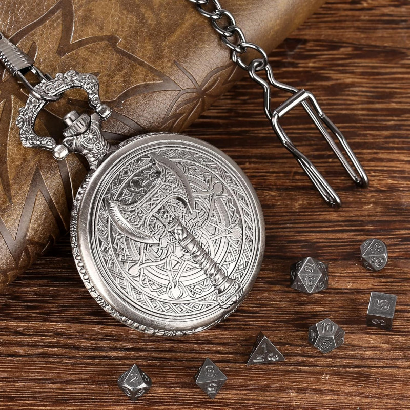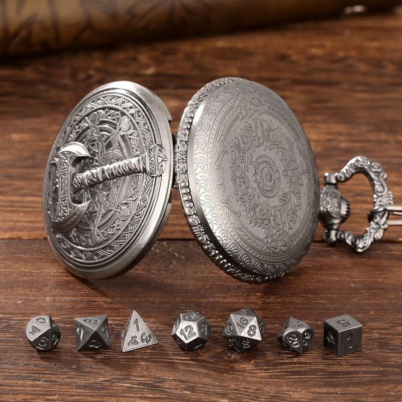 Metalowy Zegarek Kieszonkowy Pudełko na Mini Zestaw Kostek - Runiczny Topór + Zestaw 7 Malutkich Metalowych Kości