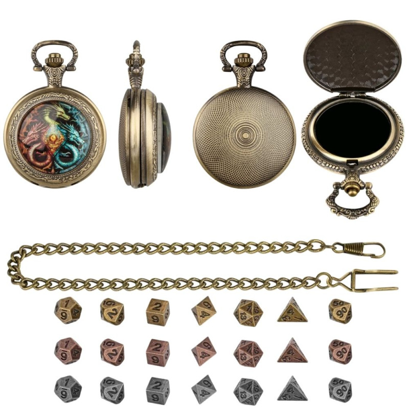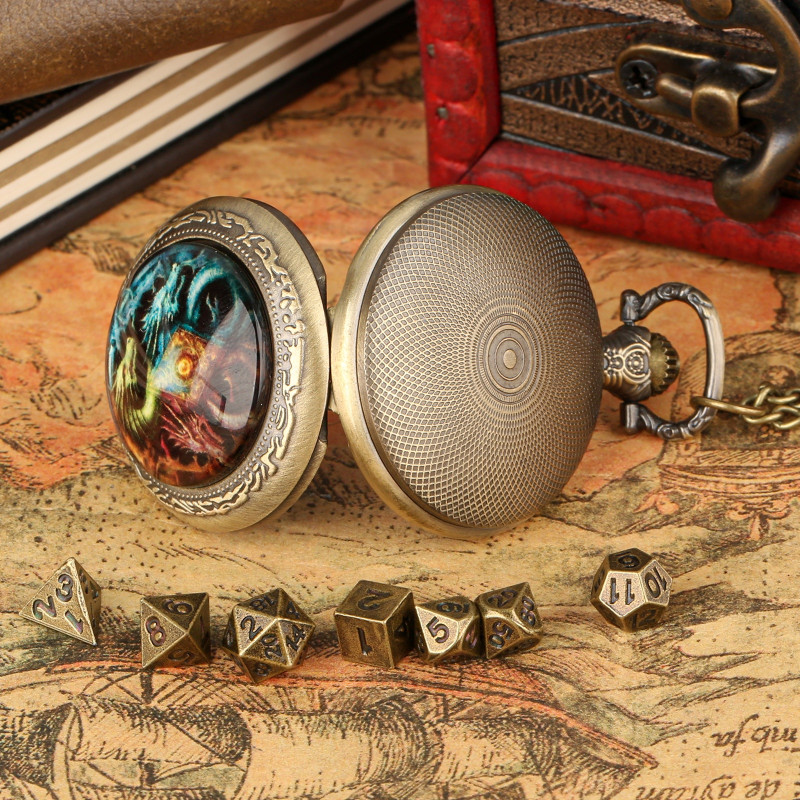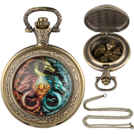Metalowy Zegarek Kieszonkowy Pudełko na Mini Zestaw Kostek - Smocze Opowieści + Zestaw 7 Malutkich Metalowych Kości