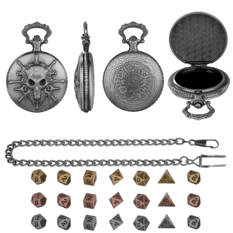 Pudełko w kształcie zegarka kieszonkowego to elegancki i funkcjonalny dodatek, który łączy klasyczny design z praktycznością. Wystarczy jedno otwarcie, aby mieć pod ręką wszystko, co niezbędne do każdej sesji – bez potrzeby szukania kości w torbie czy plecaku. Wykonany z metalu, zegarek prezentuje się stylowo i solidnie, a jego kieszonkowa forma sprawia, że zawsze możesz mieć go przy sobie. To doskonały wybór dla graczy, którzy cenią połączenie pasji z elegancją, a także dla tych, którzy szukają niepowtarzalnego sposobu przechowywania swojego zestawu kości.