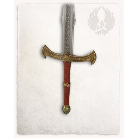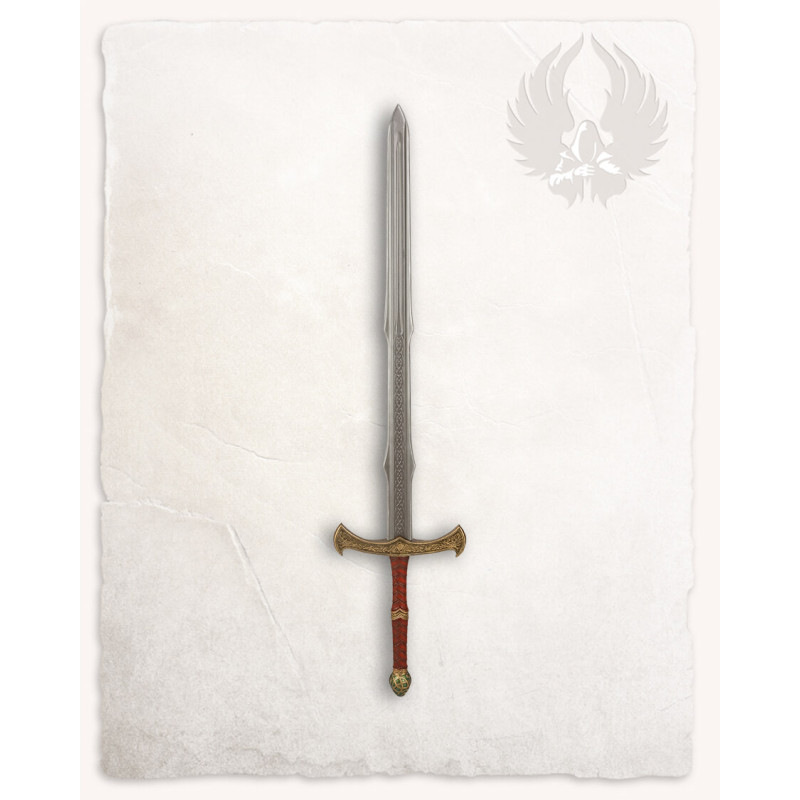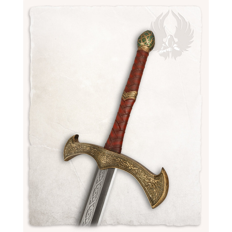 Od delikatnych podwójnych rowków po grawerowany węzłowy wzór, ten miecz prezentuje najnowszy profil ostrza Seyrawyn w pełnej, dwuręcznej długości. Odbijając imponujące detale ostrza, rękojeść zdobią efektowne złote ornamenty na głębokiej czerwonej, skórzanej imitacji owijki. Uzupełniony misternym, niemal świecącym klejnotem w głowicy, miecz wykonany jest z pianki Calimacil, co czyni go bezpieczną bronią LARP o niezrównanej wytrzymałości.