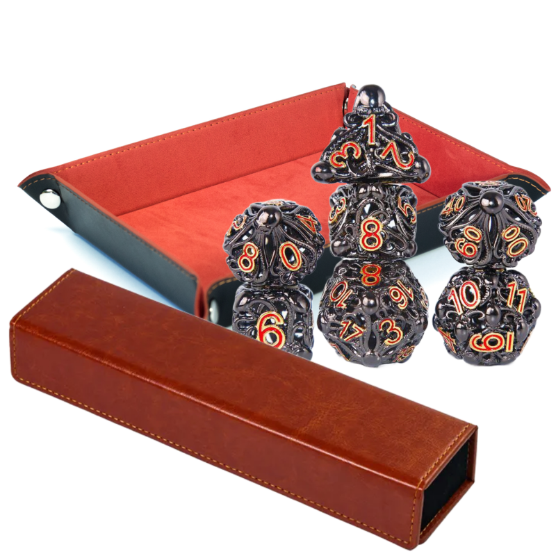 Wybierz komplet kości z tacką do rzucania, aksamitnym woreczkiem pod kolor, monetami, albo zmywalną matą. Obdaruj kogoś zestawem nietypowych kostek, które świecą w ciemności lub całym niezbędnikiem gadżetów RPG – w sam raz dla początkującego i zaawansowanego gracza!