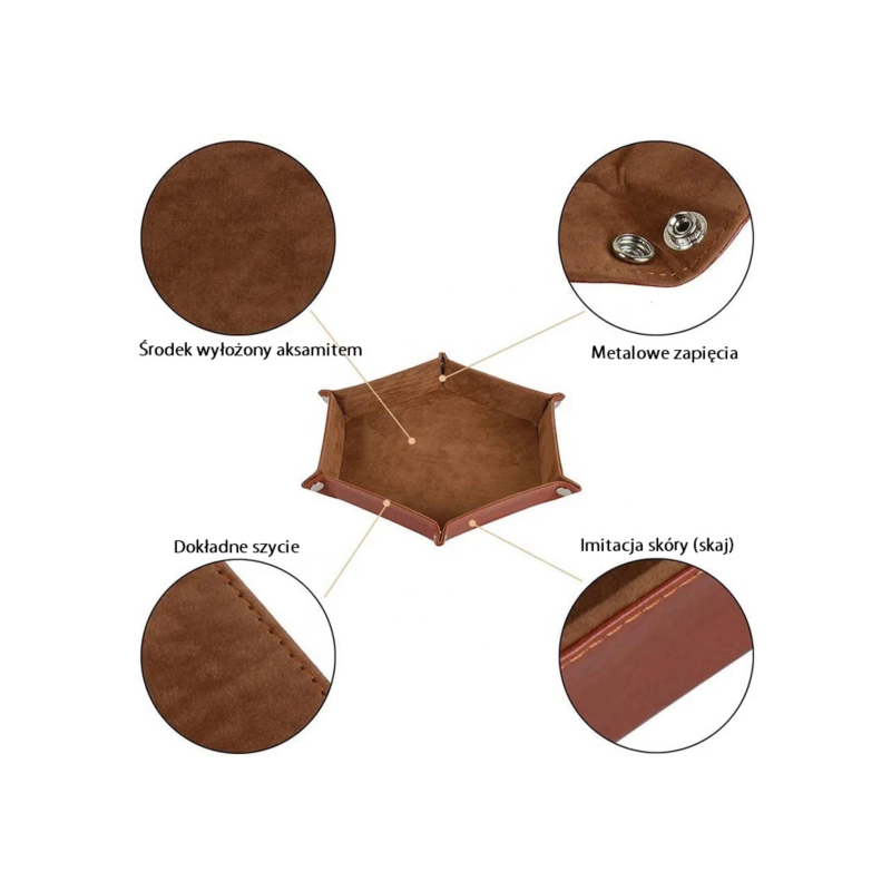 • Dice tray wielkości 22x16 cm wykonany ze sztucznej skóry i aksamitu.