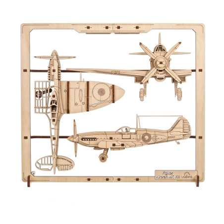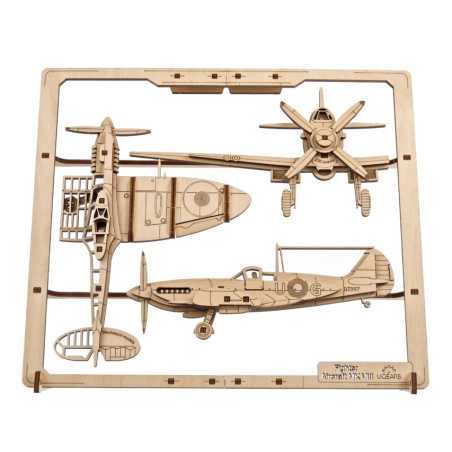 Samolot myśliwski przedstawia klasyczny Spitfire z epoki 1940 roku, słynny myśliwiec z II wojny światowej używany przez RAF i innych sojuszników. Model obrazkowy przedstawia 3 perspektywy (widok z przodu, z góry i z boku) i ma kilka ruchomych części, w tym lotkę, śmigło, koło i czaszę, aby ożywić Twoją układankę!