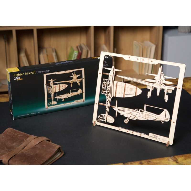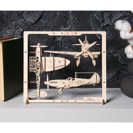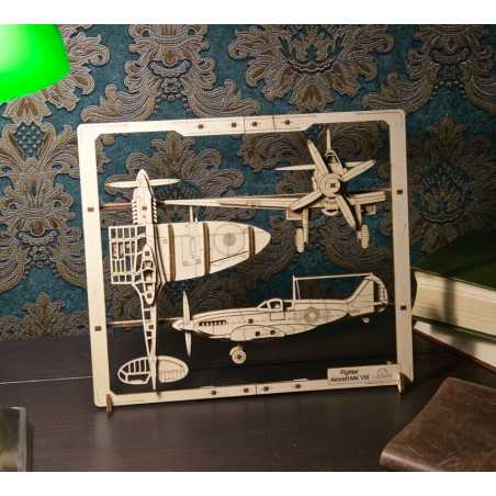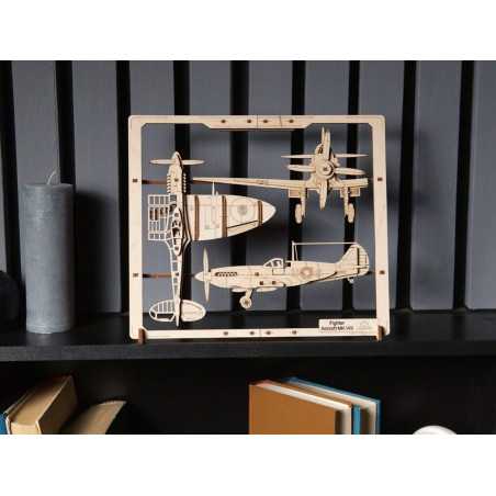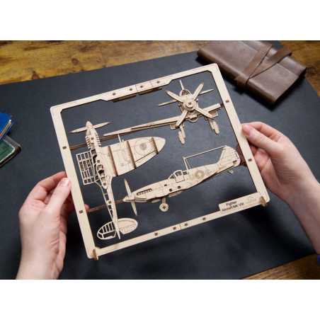 Puzzle obrazkowe Myśliwiec 2,5D to zabawny projekt DIY i atrakcyjny element ekspozycyjny dla każdego wnętrza domu lub biura. Puzzle UGEARS 2,5D wykonane są z wysokiej jakości drewna kompozytowego, posiadają rozpoznawalny wzór UGEARS i składają się bez kleju lub specjalnych narzędzi. Wystarczy wyciąć laserowo wycięte elementy z desek i ścisnąć je razem, aby stworzyć kompletny model obrazkowy. Widzowie mogą oglądać samolot pod trzema kątami i korzystać z ruchomych części tego zabytkowego modelu z czasów II wojny światowej.