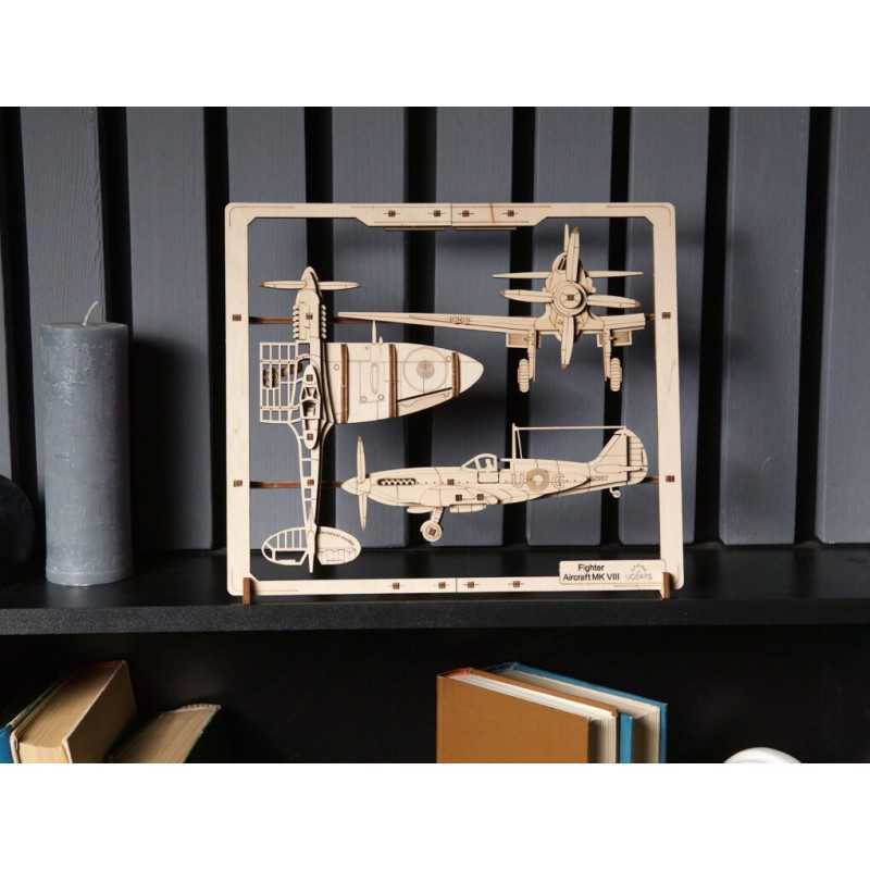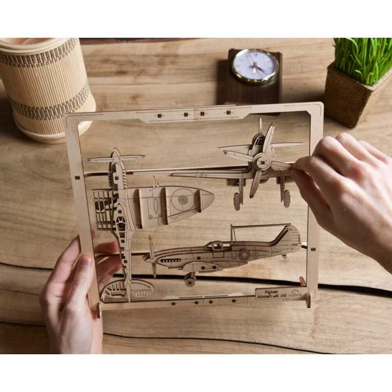 Miłośnicy klasycznych puzzli i układanek zazwyczaj muszą zakupić osobną ramkę, jeśli chcą zachować i wyeksponować swoje dzieło. Z puzzlami obrazkowymi UGEARS 2,5D nie musisz przyklejać swoich puzzli do podstawy ani szukać ramki do ekspozycji. Twój Myśliwiec jest w swojej własnej ramce, z dołączonymi podstawkami na nogi i uchwytem na obrazek – wystarczy złożyć i umieścić lub powiesić puzzle z samolotem gdziekolwiek chcesz!