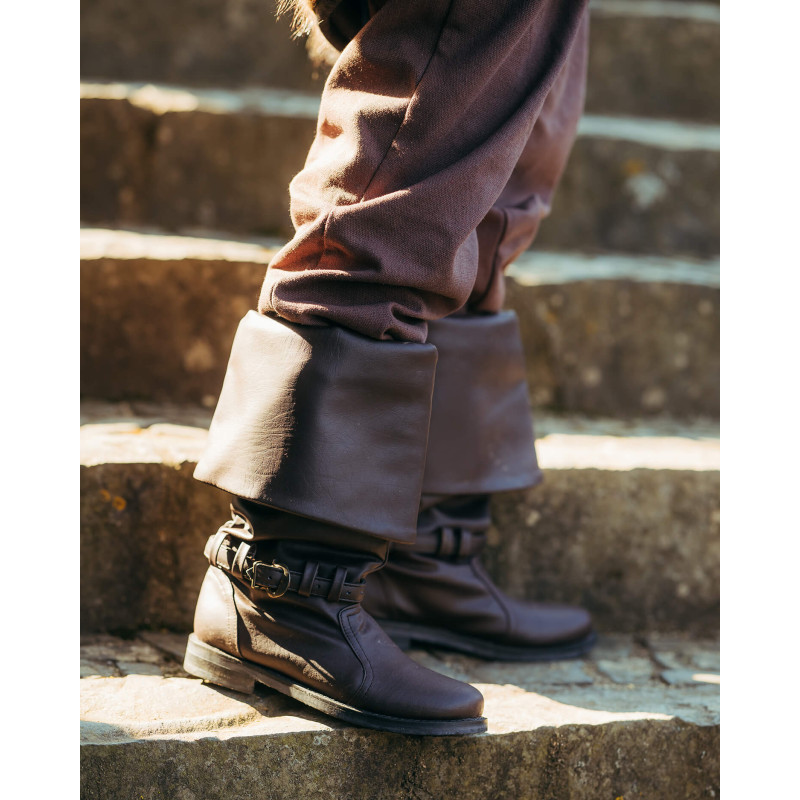Podeszwa jest solidnie klejona, co zapewnia dodatkową ochronę w mokrych warunkach. Oznacza to koniec zmartwień o przemoczone buty czy mokre stopy. Buty można zapiąć u góry paskiem ukrytym pod długą cholewą. Dodatkowy pasek gwarantuje pewne dopasowanie w okolicach kostki. Cholewy można nosić również wywinięte, co nadaje butom unikalny wygląd oraz zwiększa ciepło i ochronę. Lekka piankowa wyściółka utrzymuje stopy w cieple nawet w wilgotne, chłodne noce. Buty „Haddock” szczególnie nadają się jako obuwie kostiumowe i nie są przeznaczone do długotrwałego użytkowania w trudnym terenie.