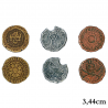 Te cynkowe monety pokryte zostały grubą warstwą odpowiednio niklu (srebrne), mosiądzu (złote) i miedzi (miedziaki). Powłoki są oksydowane, dzięki czemu wyglądają jakby używane były przez lata.