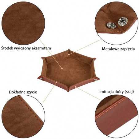 • Dice tray 22x16 cm wykonany ze skóry i aksamitu. Doskonały wybór aby utrzymać kostki w jednym miejscu i wygłuszyć dźwięk ich toczenia się. Dice tray jest wykonany ze skóry, a w środku wyłożony aksamitem. W narożnikach znajdują się wytrzymałe, metalowe napy dzięki którym możemy płaską matę zmienić w miseczkę do rzucania kośćmi. Materiał: Skaj