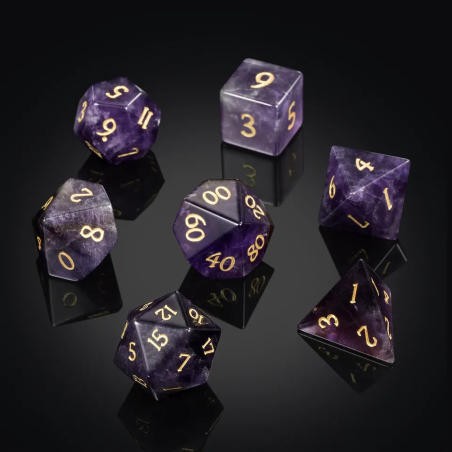 Niech Cię nie zwiedzie półszlachetność tej odmiany kwarcu, bo to kości dla prawdziwych lordów! Królewska purpura wykuta ze słupkowych struktur ametystu i ukształtowana w wielościenne bryły służy wszystkim zdroworozsądkowym arystokratom. Wszak po grecku ἀméthystos znaczy trzeźwy... w przeciwieństwie do twoich upojonych współtowarzyszy. Ech, nigdy się nie nauczą. Ostudź ich gorące głowy, turlając kości rozważnie i romantycznie! Jesteś przecież szlachcicem, mój panie. Życzę samych dwudziestek!