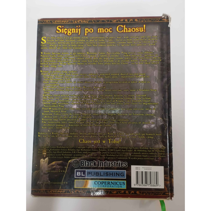 W Księdze Spaczenia, dodatku do gry fabularnej Warhammer Fantasy, Niszczycielskie Potęgi wreszcie zostają odsłonięte. Niniejsza książka ujawnia wszystkie sekrety Chaosu, opisując je nadzwyczaj starannie i z wielkim pietyzmem - począwszy od szczegółów dotyczących niezliczonych rodzajów mutacji, jakim ulec mogą istoty rozumne, poprzez różne istoty Chaosu, włącznie ze zwierzoludźmi zamieszkującymi mroczne ostępy Lasu Cieni oraz Drakwaldu, aż po straszliwe demony, zrodzone z pradawnych ludzkich koszmarów. Księga Spaczenia odpowie na wszystkie Twoje pytania dotyczące Chaosu - oraz na wiele takich, których nie miałeś odwagi zadać.