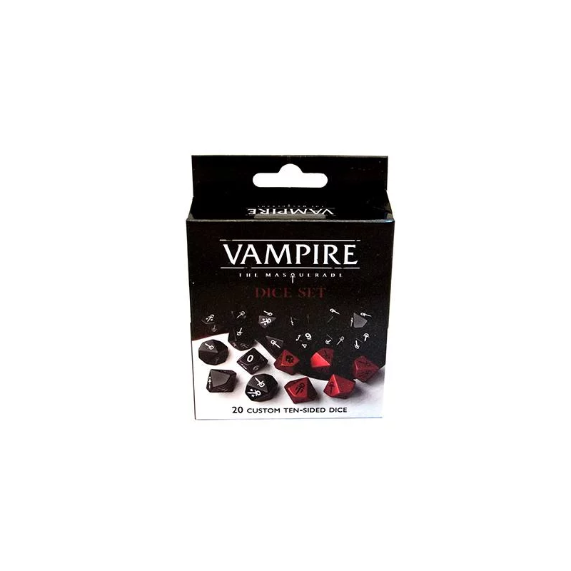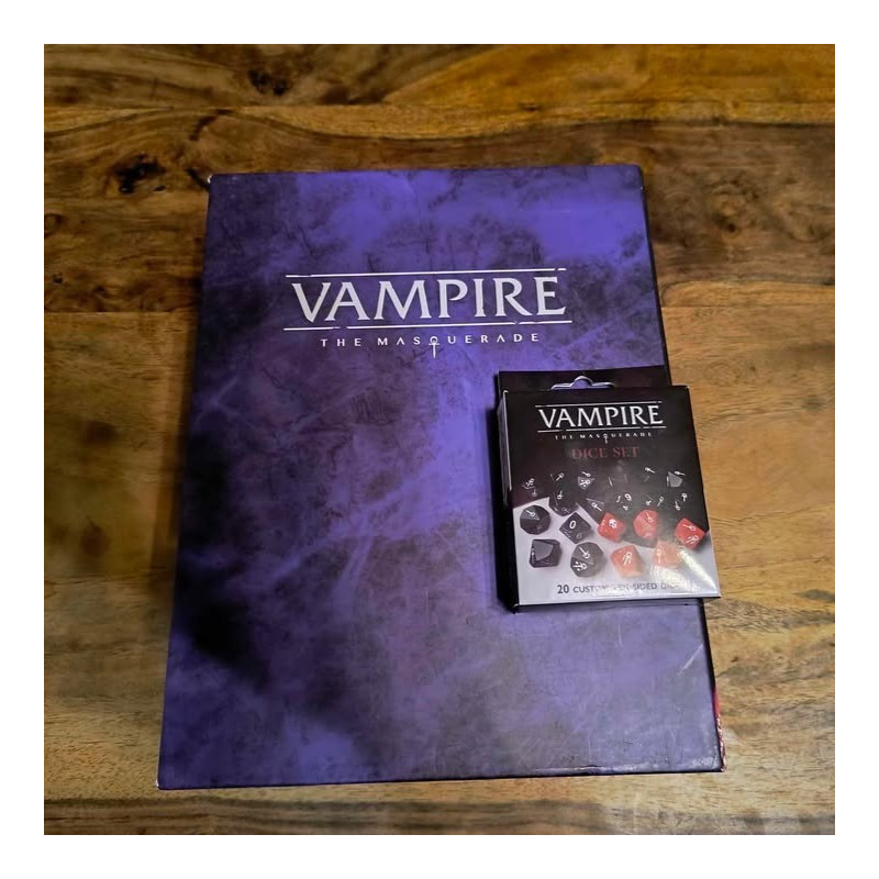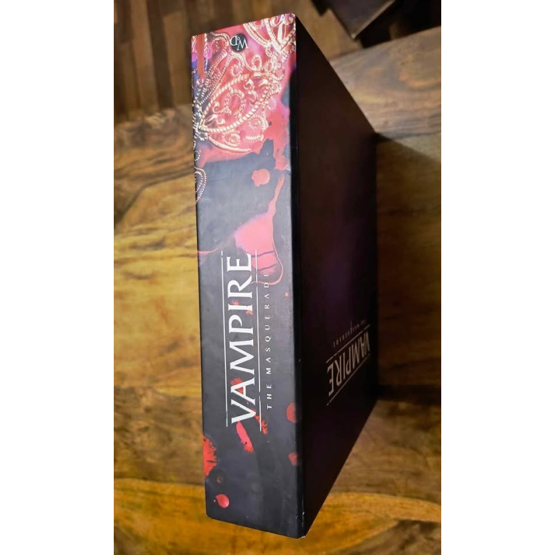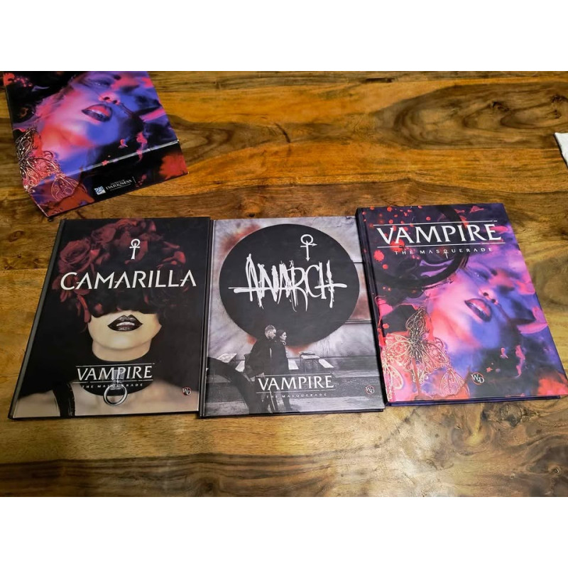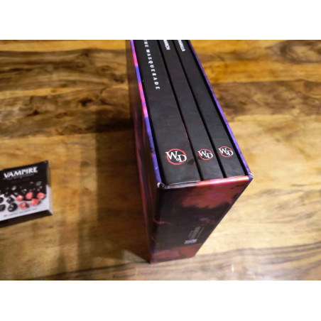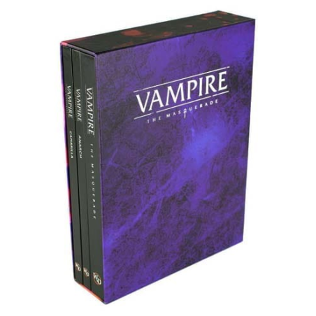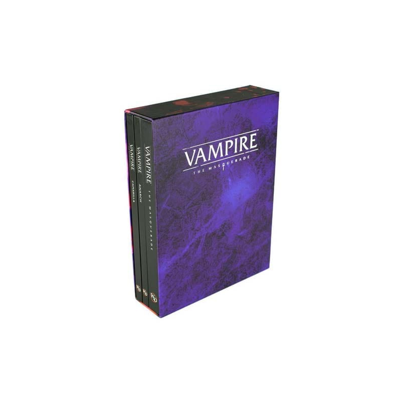 Zestaw zawiera zestaw kości oraz podręczniki do Wampir: Maskarada - Podstawowy, Camarilla i Anarchiści w specjalnej okładce typu slip case. Podręczniki w języku angielskim.