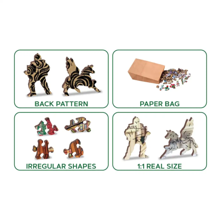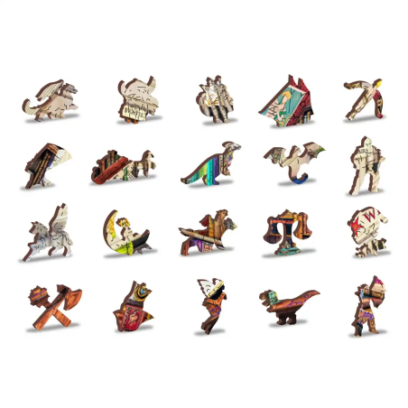 Drewniane puzzle wzywają Cię do kapryśnej sceny bibliotecznej, miejsca, w którym opowieści i wiedza są rozrzucone przypadkowo, oczekując na odkrycie.