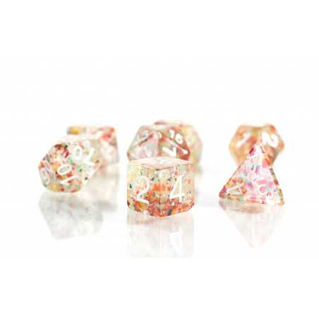 • Zestaw 7 kości wykonanych z żywicy. Idealnie nadają się do każdego systemu i dla każdego gracza.