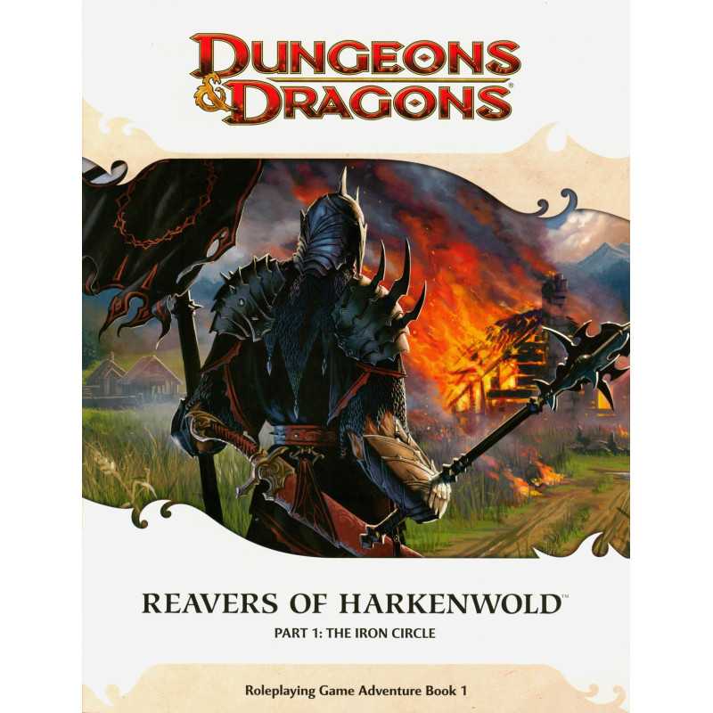 Reavers of Harkenwold is an adventure in two parts which comes with the Dungeon Master's Kit. This adventure is designed to take a group of players (preferably 5 or even 6 of them) from level 2 to level 4 in about 20 combat encounters interspersed with some roleplaying. The biggest selling point of the Reavers of Harkenwold is it's open structure. There is some flexibility: Some encounters can be skipped, or played in a different order. This adventure takes place in the Harkenwold region of the Nentir Vale and is about the plot of the Iron Circle faction.
