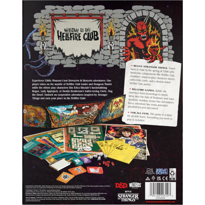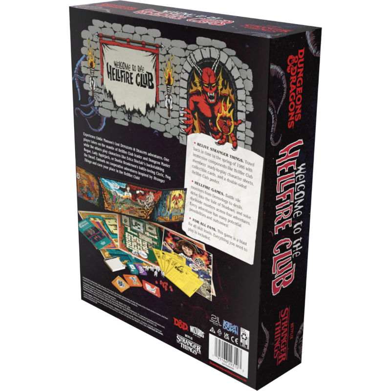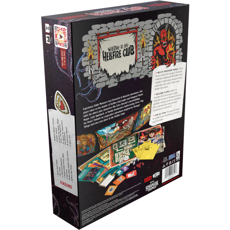 Dungeons & Dragons: Stranger Things - Welcome to the Hellfire Club to kooperacyjna gra przygodowa dla 3-5 osób na dowolnym poziomie zaawansowania, zawierająca zaginione przygody Eddiego. Podczas rozgrywek jeden z uczestników wciela się w przywódcę klubu i Mistrza Podziemi zarazem, podczas gdy pozostali mogą pokierować tymi samymi postaciami, które stworzyli dla siebie bohaterowie serialu. W pudełku znajdziemy aż 4 historie, dzięki czemu gra zapewnia wiele godzin doskonałej zabawy. Zbierz własny gang i sprawdź, jak zakończy się ta opowieść!