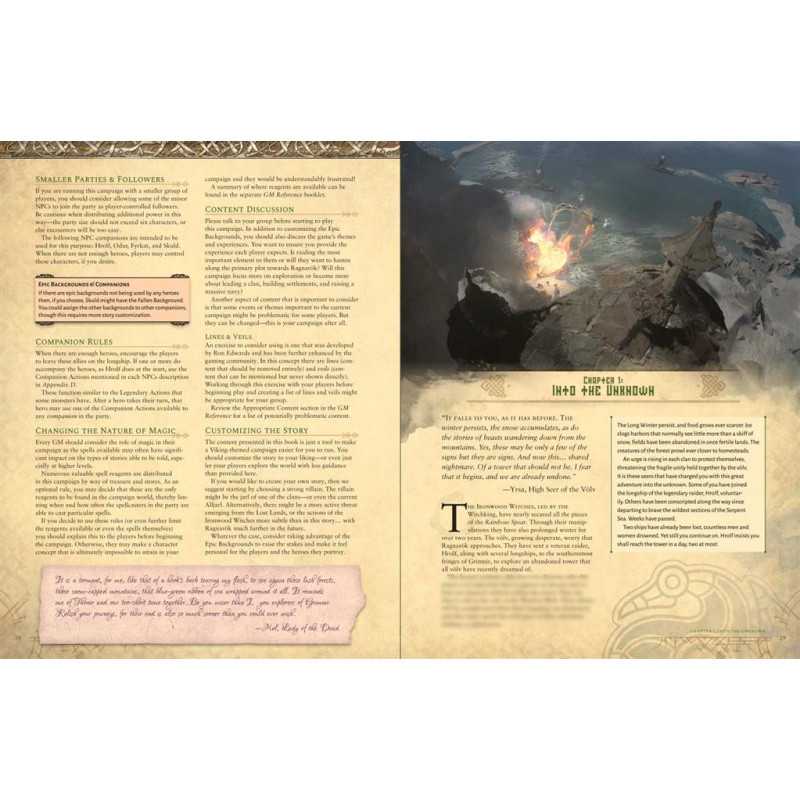 Take to the seas of Grimnir and battle against the sinister forces of a forgotten past in an epic campaign for the 5th Edition of the world’s greatest roleplaying game! Guide 4-6 players through tumultuous waters as they become heroes across a campaign that will take them from 1st to 16th level. Raiders of the Serpent Sea is a blend of high fantasy and a darker world of grim seafaring raiders. Grimnir’s clans constantly fight to survive in this doomed world filled with ancient and fantastic creatures - giants, sea serpents, saber-toothed tigers, and the world-devouring Yoten. Nowhere is safe, danger and glory abound! The Raiders of the Serpent Sea Campaign Guide hardcover includes almost 500 pages of epic adventure and supplemental material with full-color maps and illustrations that breathe life into the campaign world.