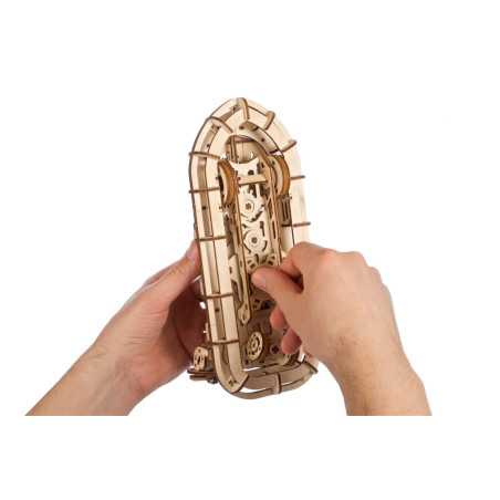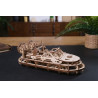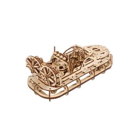 Poduszkowiec ratunkowy od UGEARS to model z drewna eleganckiego, dwuśmigłowego poduszkowca przeznaczonego do jazdy w każdym terenie w skali 1:24. Ten model z drewna do samodzielnego montażu jest napędzany silnikiem sprężynowym, z kluczem do nakręcania znajdującym się na spodzie pojazdu. Przełącznik Start/Stop pozwala nakręcić silnik, dokonując dziesięciu obrotów zgodnie z ruchem wskazówek zegara, a następnie uruchomić silnik, gdy oba śmigła zaczynają się obracać, a łódź wykonuje eleganckie, zaprogramowane skręty w lewo i prawo w odległość 3 metrów, imitując delikatny kołyszący ruch prawdziwego poduszkowca.
