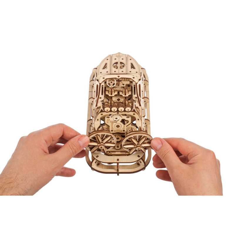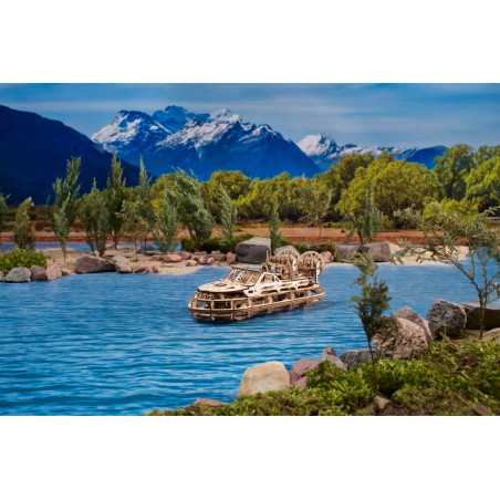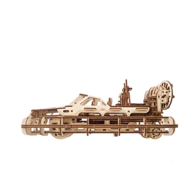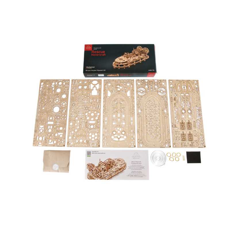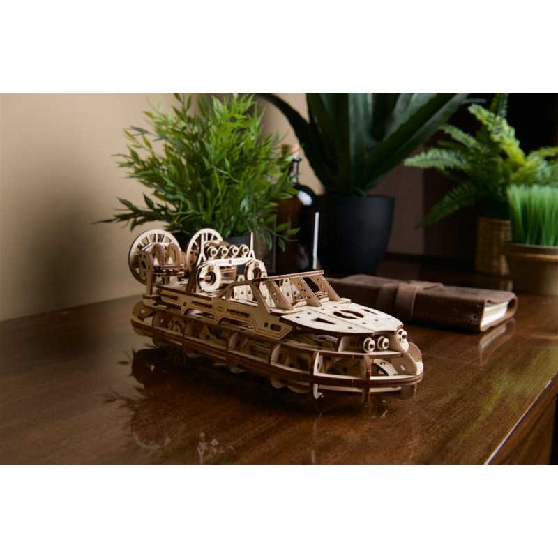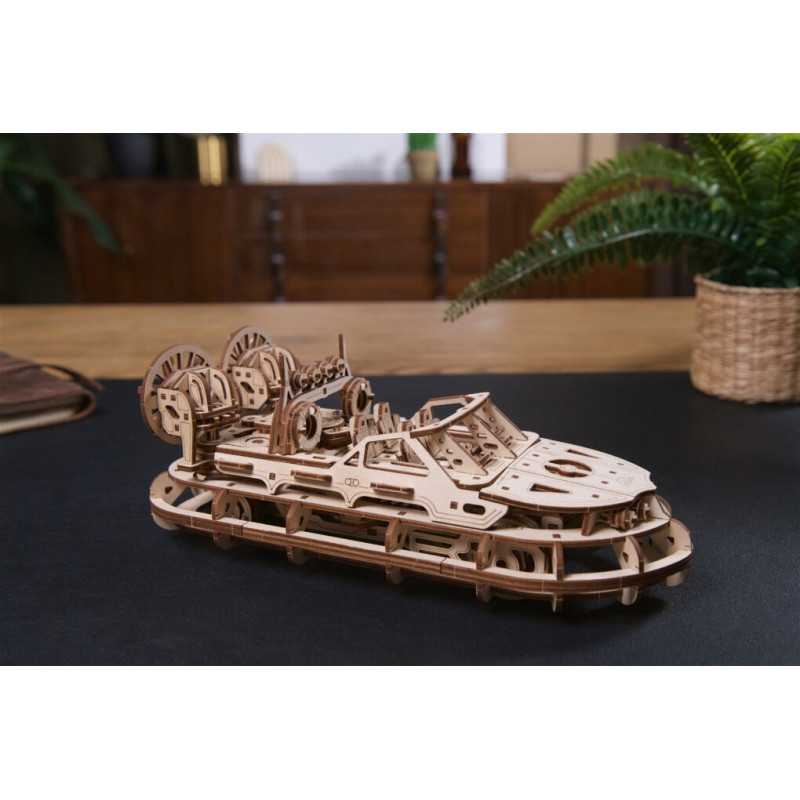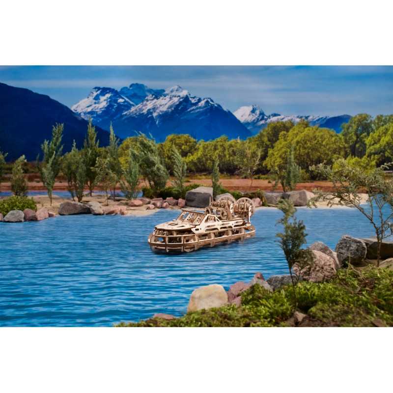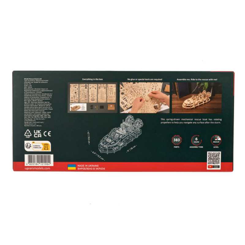 Niewiarygodny realizm, inteligentny projekt i dbałość o szczegóły to znaki rozpoznawcze modeli Ugears. Poduszkowiec ratunkowy wyposażony jest w szeroką poduszkę powietrzną, ruchomy, ręcznie obsługiwany wentylator na dziobie, grawerowane laserowo wentylatory na rufie, dwa duże wentylatory napędzane silnikiem, ster i kokpit z miejscami siedzącymi dla czterech osób, dwa zamontowane pierścienie ratunkowe, reflektory wbudowane w dziób i światła poszukiwawcze zamontowane na rufie kokpitu do ratowania w nocy.