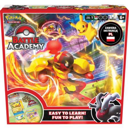 Battle Academy to idealny sposób na rozpoczęcie przygody z grą karcianą Pokémon, z oficjalnymi polskimi zasadami, zawartymi w dwóch poradnikach, pomagających zacząć rozgrywkę!   Zestaw oferuje trzy gotowe do gry talie, zawierające po 60 kart każda, spakowane w kartonowe pudełka. Każda z nich zawiera potężnego Pokemona ex i oferuje odmienne strategie rozgrywki.    Pikachu Ex to elektryczny Pokémon, którego potężny atak potrafi co turę zadawać bolesne obrażenia, a dzięki niskiemu kosztowi wycofania się może opuścić pole walki w dogodnym dla nas momencie, co pozbawi przeciwnika dwóch kart nagrody za jego pokonanie. Darkrai ex jest Pokémonem typu mrocznego, posiada dwa ataki, a jednym z nich może zadawać obrażenia już od drugiej tury. Armarouge ex jest ewolucją Charcadet'a o bardzo wysokiej liczbie punktów wytrzymałości i absurdalnie mocnym atakiem, który jednak kosztuje odrzucenie jednej karty energii. Z uwagi na ewolucję nie wprowadzimy go na pole walki natychmiast, ale przy dobrym planowaniu potrafi przechylić szalę zwycięstwa na naszą korzyść.   Pojedynek na arenie przy użyciu tych talii jest dynamiczny i ekscytujący, a z każdą potyczką zdobywamy nowe doświadczenie. Dzięki polskim zasadom rozgrywki możemy nauczyć się sekwencji tur i poprowadzić rozgrywkę z osobami nieznającymi języka angielskiego, a gdy dojdziemy do wprawy, możemy zmienić talię i spróbować swoich sił w innej konfiguracji. Po kilku rozgrywkach możemy zacząć ulepszać swoją ulubioną talię o nowe karty, które zdobędziemy kupując inne produkty marki Pokémon TCG albo wymieniając się z innymi graczami.   W grze Pokémon TCG ważne jest zarówno zbieranie kart, opracowanie skutecznej taktyki, jak i odpowiednie wykorzystanie swoich zdolności. Dzięki Battle Academy możesz wcielić się w rolę trenera Pokémonów i przekuć zdobytą wiedzę w zwycięstwo.    Czy jesteś gotowy na kolejny pojedynek?   Wszystkie karty i akcesoria zawarte w zestawie są w języku angielskim, zaś oba poradniki i podręcznik zasad zaawansowanych - w języku polskim.