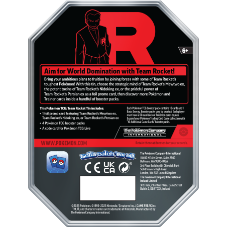 Spełnij swoje najambitniejsze plany, łącząc siły z jednym z najpotężniejszych zespołów w świecie Pokémon. W tej puszce czeka na Ciebie wyjątkowa karta promo w wersji foil, przedstawiająca jednego z kluczowych Pokémonów drużyny - strategicznie myślącego Mewtwo ex, toksycznie potężnego Nidokinga ex lub emanującego elegancką siłą Persiana ex. Twoją kolekcję rozbudują 4 boosterki Pokémon TCG, pełne ekscytujących kart.