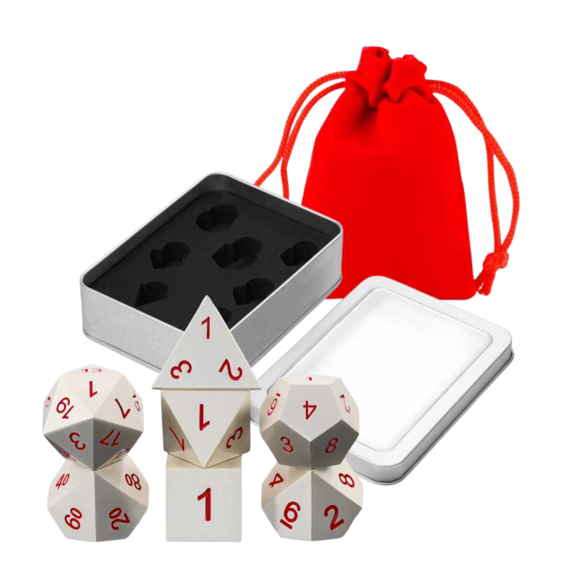 Wybierz komplet kości z tacką do rzucania, aksamitnym woreczkiem pod kolor, monetami, albo zmywalną matą. Obdaruj kogoś zestawem nietypowych kostek, które świecą w ciemności lub całym niezbędnikiem gadżetów RPG – w sam raz dla początkującego i zaawansowanego gracza!