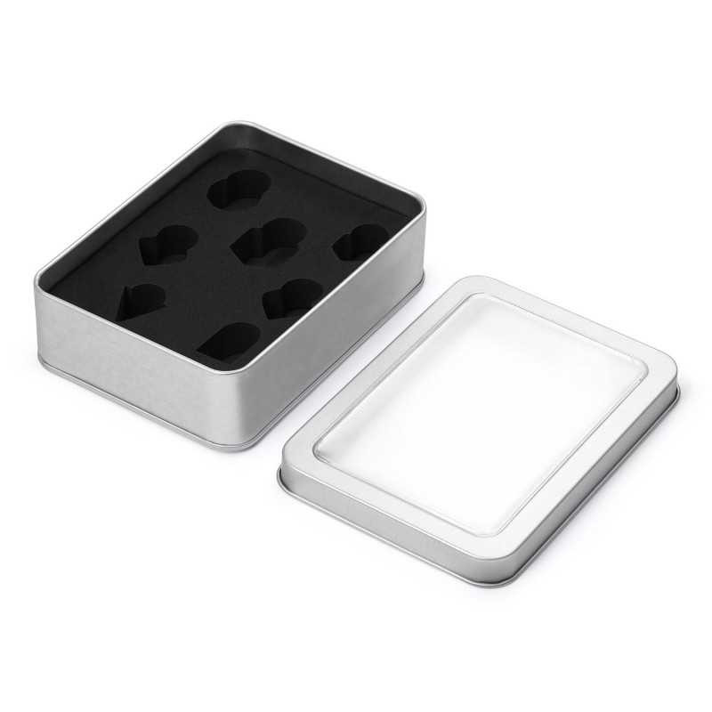 • Estetycznie wykonane metalowe pudełko przeznaczone do przechowywania kostek. Wymiary: 12,5x9,6x3,5 cm