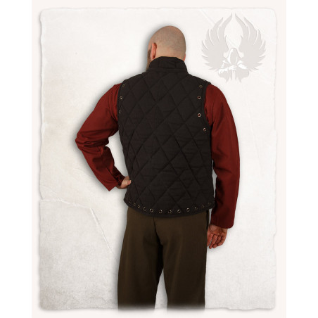 Pikowana kamizelka "Arthur" jest przeszywana w romby i zapinana z przodu na cztery paski z klamrami. Rękawy oraz dół kamizelki są wyposażone w mosiężne oczka, które umożliwiają łatwe przypięcie naręczników i nakolanników. Przeszycie w kształcie rombów zapewnia większą swobodę ruchów, a jednocześnie utrzymuje równomierne rozmieszczenie watowania, chroniąc przed stłuczeniami i otarciami. Kołnierz przeszyty w drobniejsze romby zwiększa komfort noszenia w okolicy szyi.