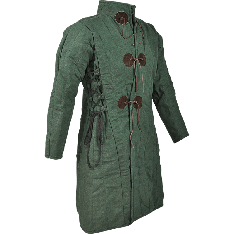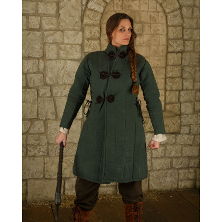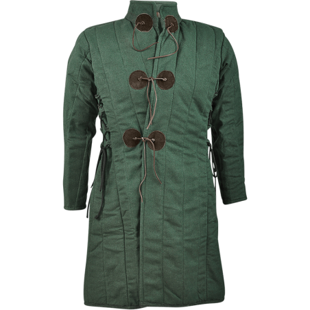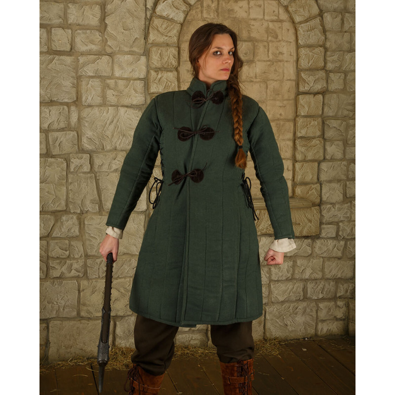 Przeszywanica "Shapur" inspirowana jest orientalnymi strojami. Może być zapinana z przodu za pomocą trzech skórzanych pasków. Co wyróżnia to zapięcie, to diagonalne nakładanie się materiału, podobne do kimona, co nadaje "Shapur" orientalny charakter. Możliwość dopasowania w talii jest szczególnie interesująca dla kobiet. Rozmiar i dopasowanie można indywidualnie regulować za pomocą sznurków po bokach. Przeszywanica ma mocną, łatwą do uchwycenia wyściółkę, nie będąc zbyt grubą. Wyściółka jest cieńsza w okolicach ramion, by nie ograniczać swobody ruchów. Przeszywanica "Shapur" jest wyjątkowa nie tylko ze względu na swój krój, ale również dzięki cienkiej, ale solidnej wyściółce, która sprawia, że prawie szkoda ją ukrywać pod kolejnymi elementami zbroi.