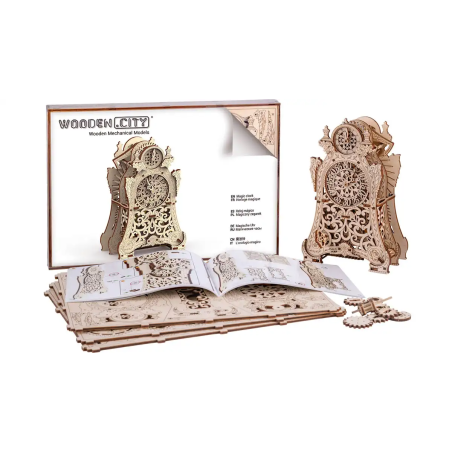 Dodając dodatkowy akcent wszechstronności, pakiet zawiera drewniane pudełko, które przekształca się w podstawę, prezentując Twój zmontowany Magiczny Zegar. To nie tylko model, ale centrum uwagi, które wyróżnia się w Twoim wnętrzu swoją ponadczasową elegancją i angażującą mechaniką.