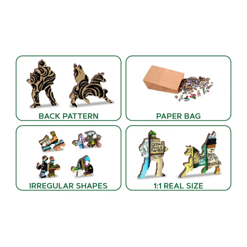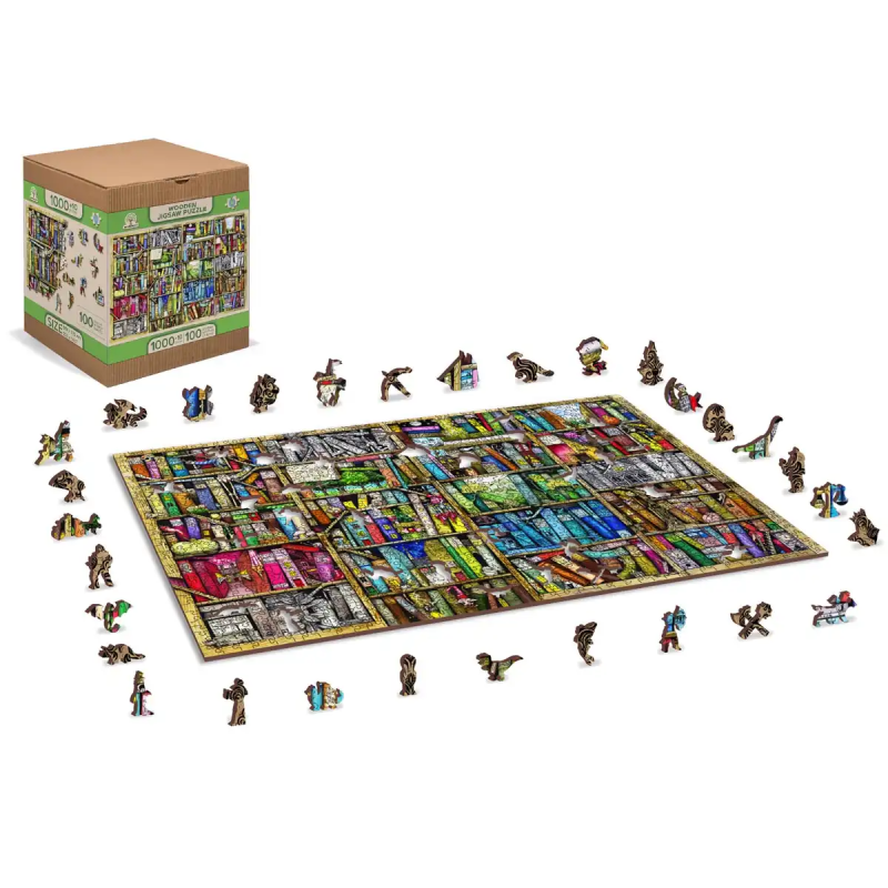 Odkryj zniewalający urok naszego Drewnianego Puzzle, gdzie bajkowe opowieści ożywają. Złożone z misternie wykonanych elementów, przedstawia ono duży kapryśny regał z książkami, pełen przygód. Dziewczyna wspina się na drabinę, by wybrać swoją następną opowieść, podczas gdy mityczne konie i postacie swawolą obok bujnie kwitnących kwiatów, chętne do podzielenia się swoimi historiami.