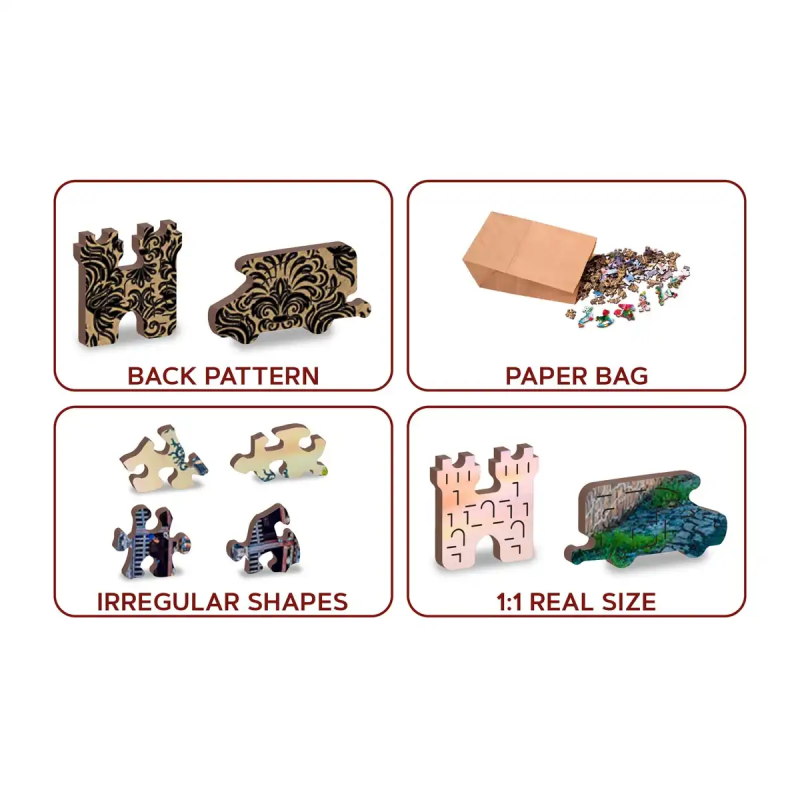 Każdy kawałek w tym zestawie ma unikalny kształt, a duże elementy tematyczne, takie jak zwierzęta czy zabytki, dodają zabawy. Bez względu na to, czy to układanka przedstawiająca zwierzęta czy miejsca historyczne, znajdziesz charakterystyczne elementy, które uczynią proces układania jeszcze bardziej angażującym.