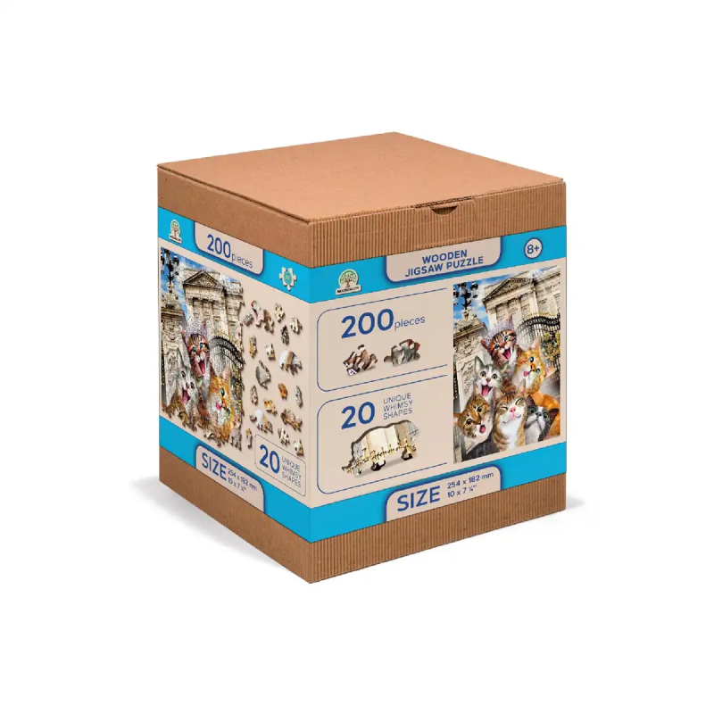 Starannie wykonany w sercu Europy, w Polsce, ten Drewniany Puzzle zaprasza entuzjastów do zaczarowanego świata. Zawierając 200 unikatowych elementów, maluje scenę zabawnych kotów, uwieczniających moment selfie. Te mruczące przyjaciele, uśmiechające się i figlarnie wystawiające języki, ożywają na tle wspaniałości Buckingham Palace. Klejnotem w koronie jest jeden szczególny kotek, królewsko ozdobiony!