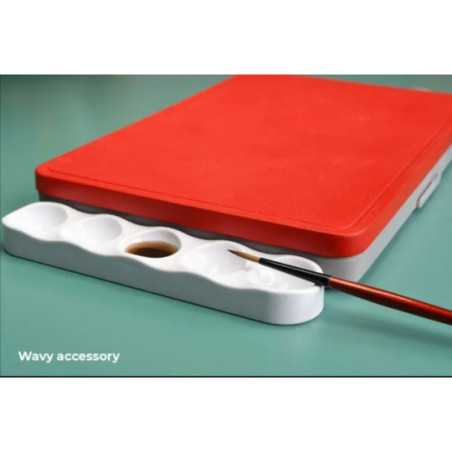 Wavy jest  akcesorium dostępnym dla mokrych palet RedGrass idealnym do mieszania farb i tuszu, które może posłużyć również za podstawkę pod pędzelek. Dzięki systemowi zaczepów łatwo przytwierdzić je do dowolnej strony palety. Łatwe w czyszczeniu.