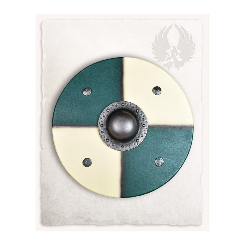 Okrągła tarcza „Rorrik” z serii „Battle Standard” to klasyczna tarcza o kształcie tarczy wikińskiej, znana z ulubionych filmów i seriali o Wikingach. Dostępna jest w różnych kolorach, a także w wersji z wyglądem drewna. Z tyłu krawędź i uchwyt są przymocowane do solidnej płyty z tworzywa sztucznego, co zapewnia tarczy stabilność.